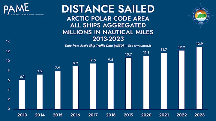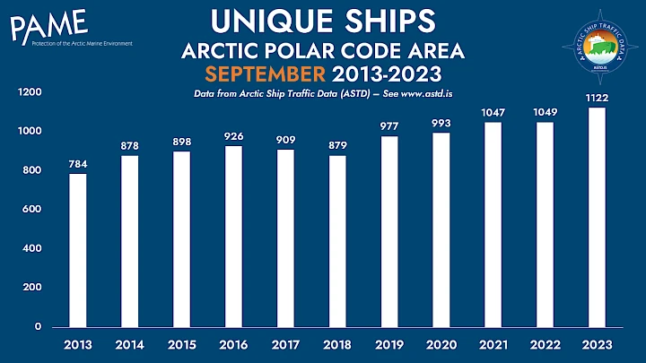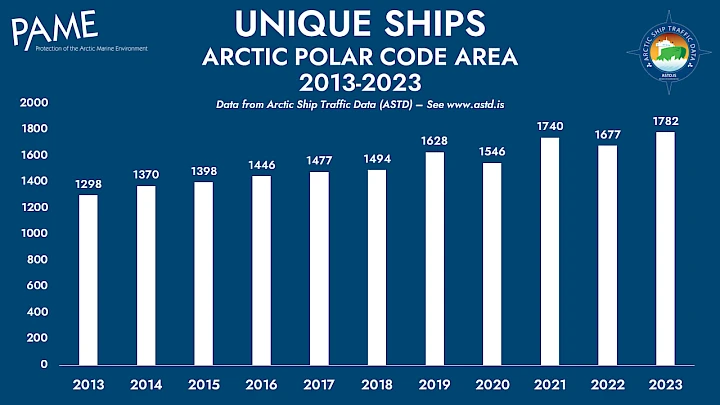 © Adobe Stock Arctic Shipping Update: 37% Increase in Ships in the Arctic Over 10 Years January 31, 2024OceanProtection of the Arctic Marine Environment The Arctic Council Working Group on the Protection of the Arctic Marine Environment (PAME) published an update of 10-year trends in Arctic shipping, utilizing its Arctic Ship Traffic Data (ASTD) System. Arctic shipping continues to increase, according to an update of PAME’s Arctic Shipping Status Report #1: The Increase in Arctic Shipping. The original report covered the period 2013-2019. The updated report adds data for 2020-2023. Increase in ships in the Arctic and distance sailed The number of unique ships entering the Arctic Polar Code area[1] from 2013 to 2023 increased by 37%, around 500 ships. Unique ships refers to each ship only counted once, although it might enter the area multiple times over each year.