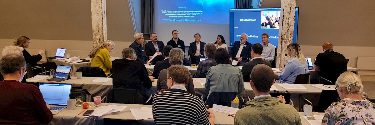 © contributed Workshop on Ecosystem-Based Management Concludes: Managing Arctic marine ecosystems requires international, multidisciplinary, and cross-sectoral cooperation December 17, 2024 To promote healthy and productive oceans and enhance sustainability of Arctic Ocean industries, the Norwegian Chairship of the Arctic Council (2023-2025) has focused on integrated ocean management. One important tool for regulating human activities to avoid critical impacts on the ecosystem is the Ecosystem Approach to Management. As part of its Chairship Program, Norway hosted the third International Conference on Ecosystem Approach to Management in Arctic Large Marine Ecosystems earlier this year. To follow up on the conference’s important outcomes, the Norwegian Chairship and international partners recently convened a workshop in Copenhagen, Denmark, to identify effective ways to promote international collaboration for producing, accessing, synthesizing, and sharing knowledge of the Central Arctic Ocean among organizations and Working Groups involved in the production of relevant knowledge, and those using this knowledge as a basis for advice and management decisions.Arctic warming, retreating sea ice, and increased human activity are causing unprecedented changes with far-reaching consequences for Arctic marine ecosystems and the communities that rely on them. Ecosystem-based management – or ecosystem approach to management (EA) – is an established practice that offers approaches to address these challenges. The third International Conference on Ecosystem Approach to Management in Arctic Large Marine Ecosystems (LMEs), held in April 2024 in Tromsø, Norway, highlighted the importance of effective cooperation to ensure a safe and sustainable future for the Arctic. The Arctic Council and other international bodies view the ecosystem approach to LMEs as an important ongoing and future step to achieve this. For more information and to learn about the conference outcomes, read the conference report. To follow up on these outcomes and prepare for continued work under the upcoming Arctic Council Chairship of Kingdom of Denmark commencing in May 2025, a workshop was held in Copenhagen, Denmark, from 10-12 December 2024. The workshop brought together 28 in-person and 11 online representatives from organizations representing Arctic governance, science and Indigenous Peoples to discuss and identify effective ways to promote international collaboration that can produce, share, access, synthesize, and make evidence-based advice relevant to EA in Arctic LMEs. During three intensive workshop days, participants discussed the information needed by organizations with mandates to provide management advice or make management decisions. They explored who can produce and deliver this information, and how the collection, assessment, synthesis and sharing of relevant information can be made more effective across the involved organizations and Working Groups.